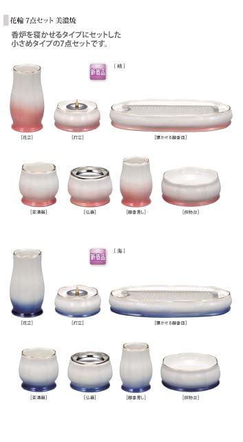 美濃焼 花輪7点セット(花立・灯立・線香皿・茶湯器・仏器・線香差し・供物台)・りん台3点セット